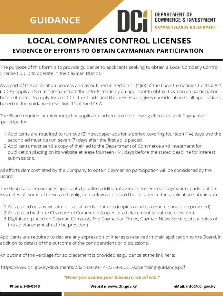 GUIDANCE LOCAL COMPANIES CONTROL LICENSES EVIDENCE OF EFFORTS TO OBTAIN CAYMANIAN Participation purpose of this form is to provide guidance to applicants seeking to obtain a Local Company Control