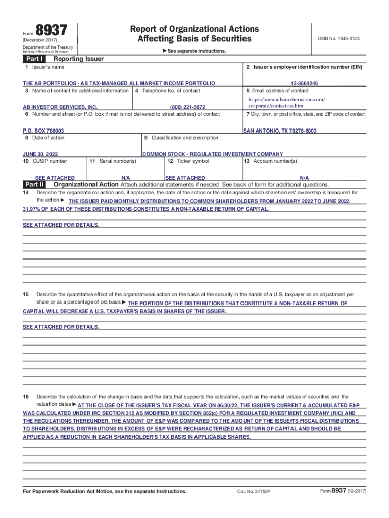 8937Report of Organizational Actions Affecting Basis of SecuritiesForm (December 2017) Department of the Treasury Internal Revenue Serviceman Ia See separate instructions. Reporting Issuer1 Issuer\'s