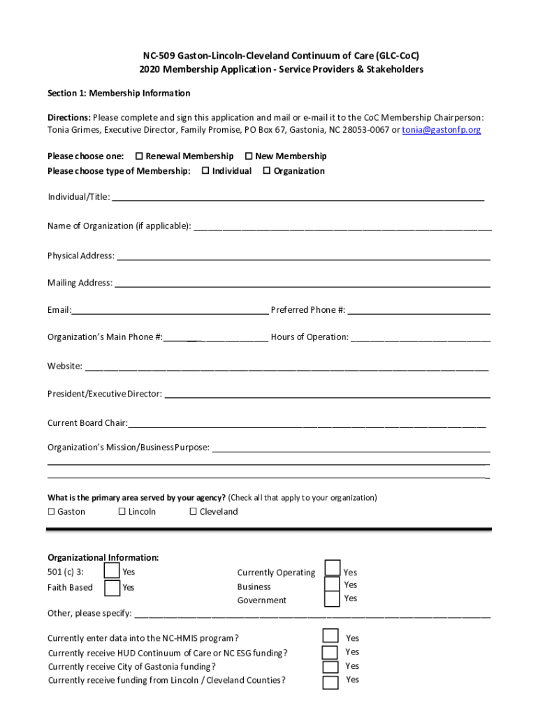 NC509GastonLincolnClevelandContinuumofCare(Glycol) 2020MembershipApplicationServiceProviders&Stakeholders Section1:MembershipInformation Directions:PleasecompleteandsignthisapplicationandmailoremailittotheCoCMembershipChairperson: