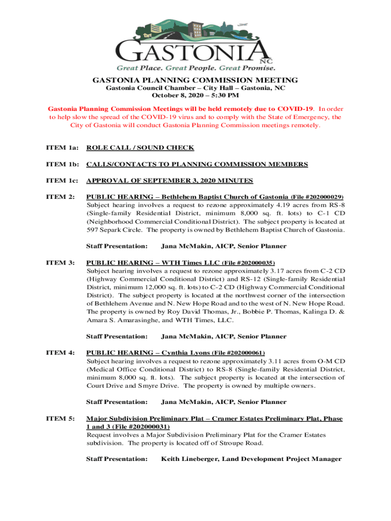 GASTONIA PLANNING COMMISSION MEETING Gastonia Council Chamber City Hall Gastonia, NC October 8, 2020 5:30 PM Gastonia Planning Commission Meetings will be held remotely due to COVID-19. In order to