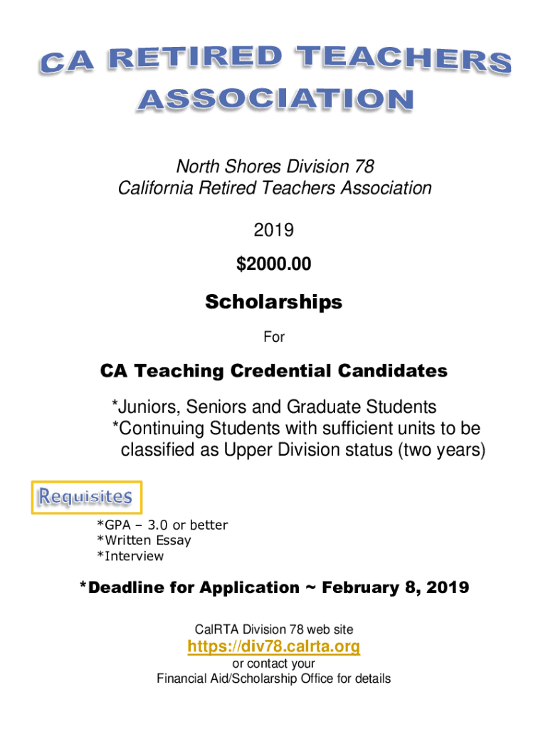 North Shores Division 78 California Retired Teachers Association $20192000.00Scholarships Force Teaching Credential Candidates *Juniors, Seniors and Graduate Students *Continuing Students with sufficient