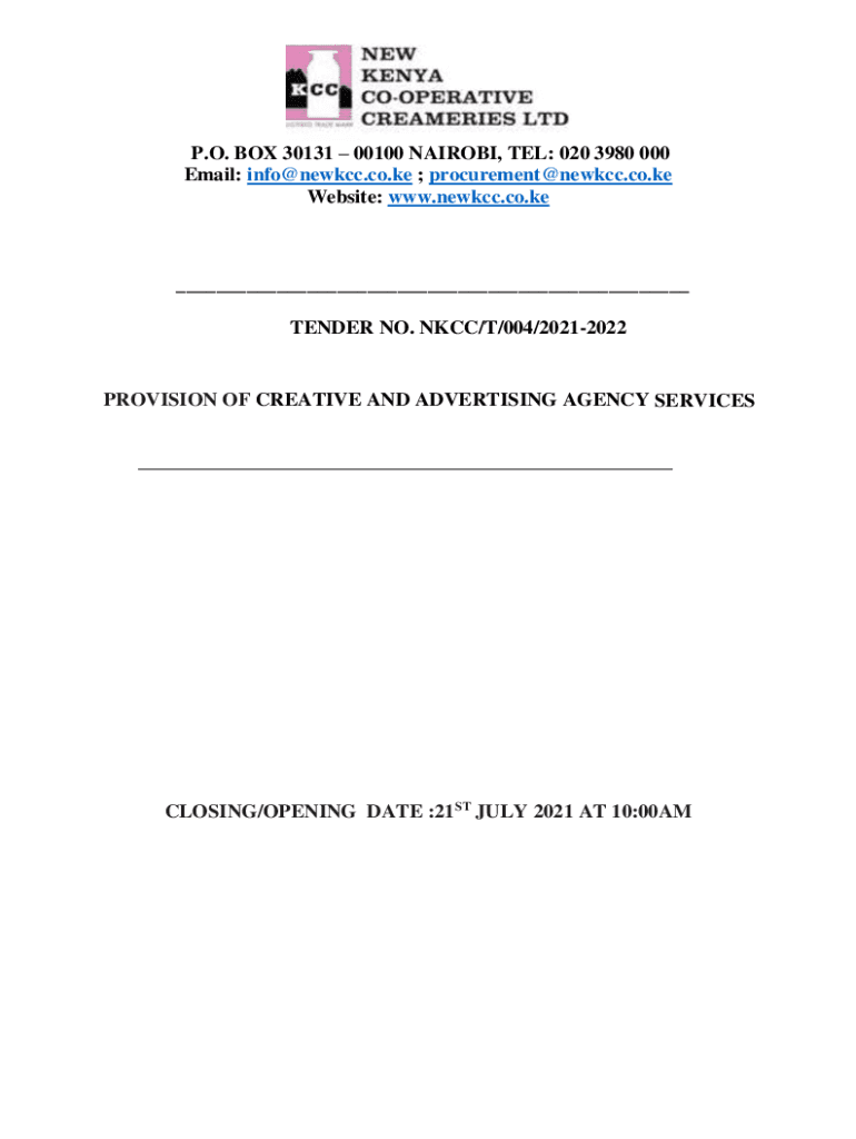 P.O. BOX 30131 00100 NAIROBI, TEL: 020 3980 000 Email: info@newkcc.co.ke ; procurement@newkcc.co.ke Website: www.newkcc.co.ke___ TENDER NO. NCC/T/004/20212022PROVISION OF CREATIVE AND ADVERTISING