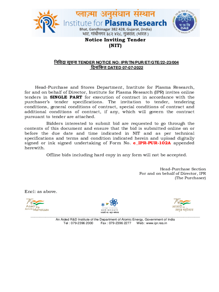 Notice Inviting Tender (NIT) TENDER NOTICE NO: IPR/TN/PUR/ET/GTE/2223/004 DATED 07072022HeadPurchase and Stores Department, Institute for Plasma Research, for and on behalf of Director, Institute