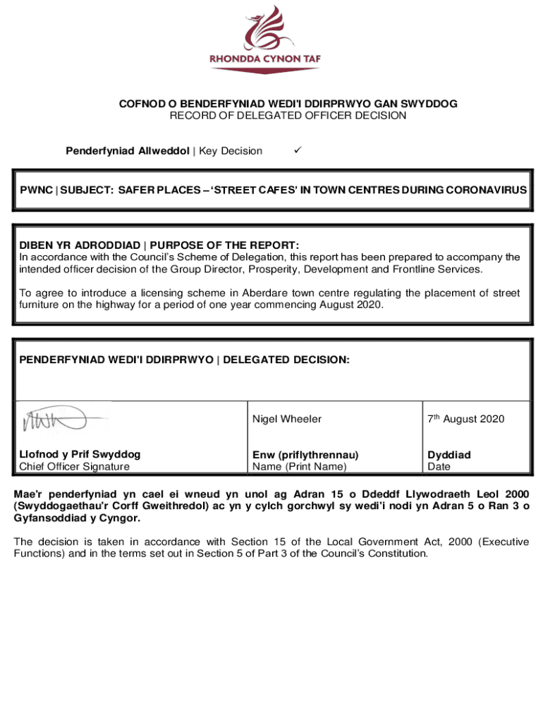 RECORD OF DELEGATED OFFICER DECISIONPenderfyniad Allweddol | Key Decisioning | SUBJECT: SAFER PLACES STREET Cafés IN TOWN Centers DURING CORONAVIRUSDIBEN