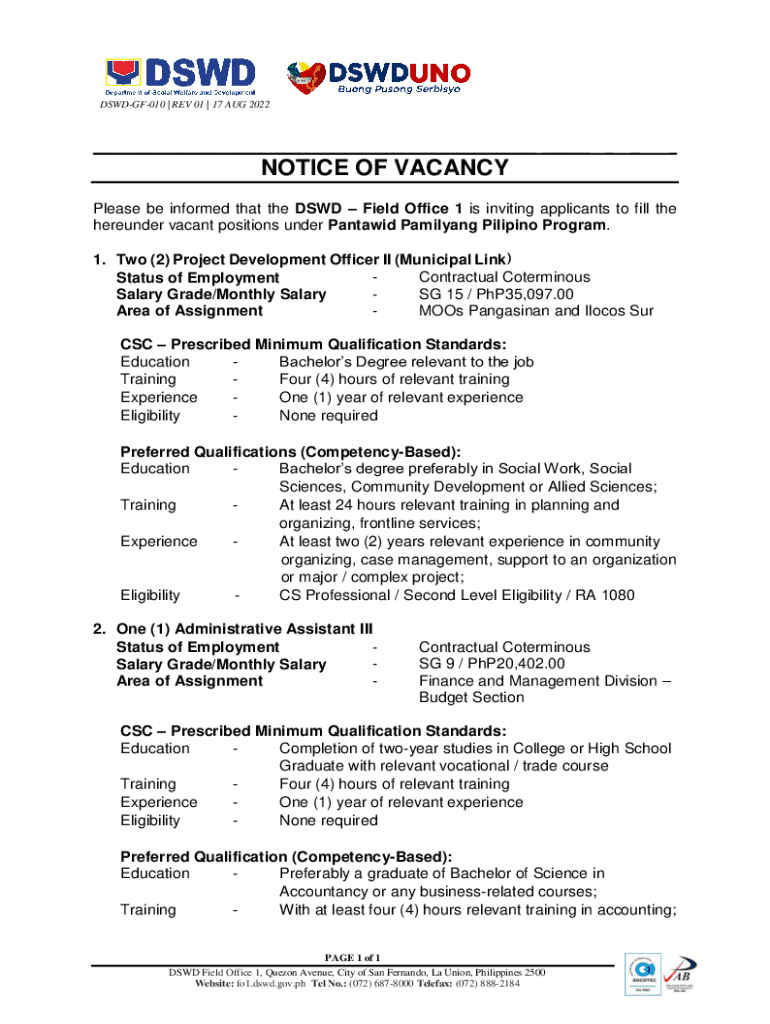 DSWDGF010 | REV 01 | 17 AUG 2022___ ______NOTICE OF VACANCY Please be informed that the DSD Field Office 1 is inviting applicants to fill the hereunder vacant positions under Antacid Pacifying Filipino