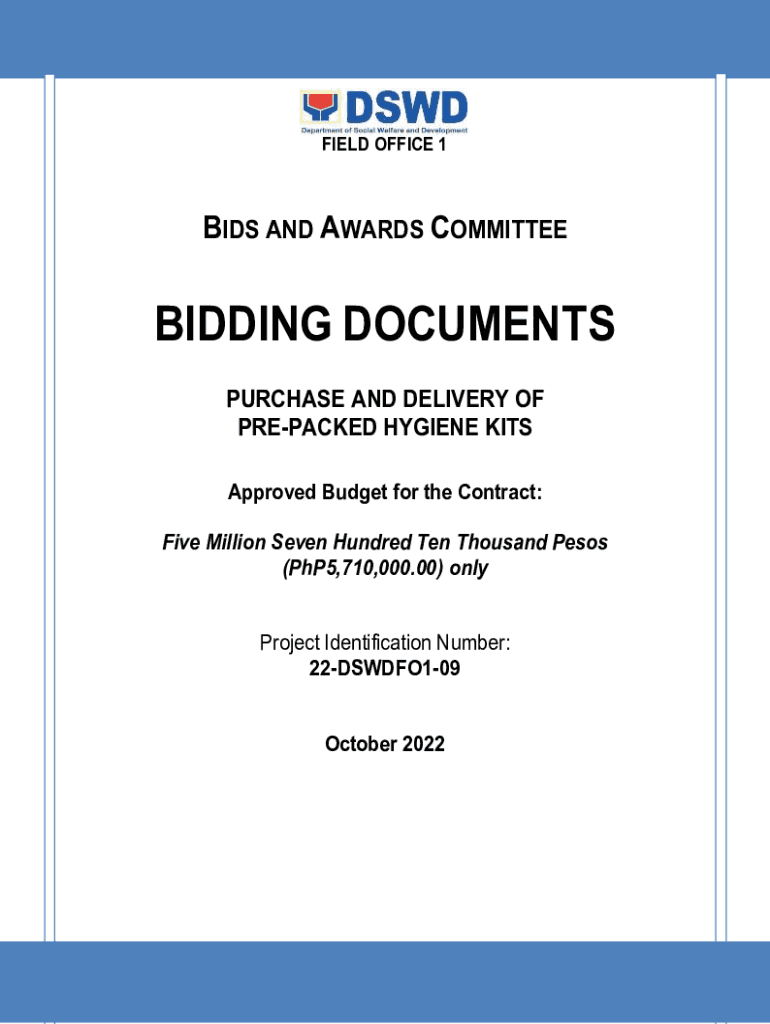 FIELD OFFICE 1BIDS AND AWARDS COMMITTEEBIDDING DOCUMENTS PURCHASE AND DELIVERY OF PREPACKED HYGIENE KITS Approved Budget for the Contract: Five Million Seven Hundred Ten A Thousand Pesos (PhP5,710,000.00)