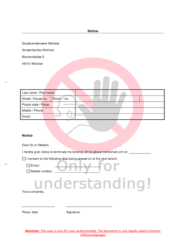 Notice - Studierendenwerk Münster is a document that students must submit to the student services organization in Münster.