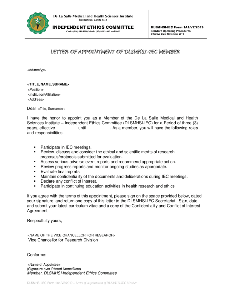 De La Sale Medical and Health Sciences Institute Tasmania, Cavity 4114INDEPENDENT ETHICS COMMITTEE Cavity (046) 4818000/ Manila (02) 9883100 Local 8042I.STRUCTURE AND COMPOSITIONDLSMHSIIEC Form 1A1/V2/2019