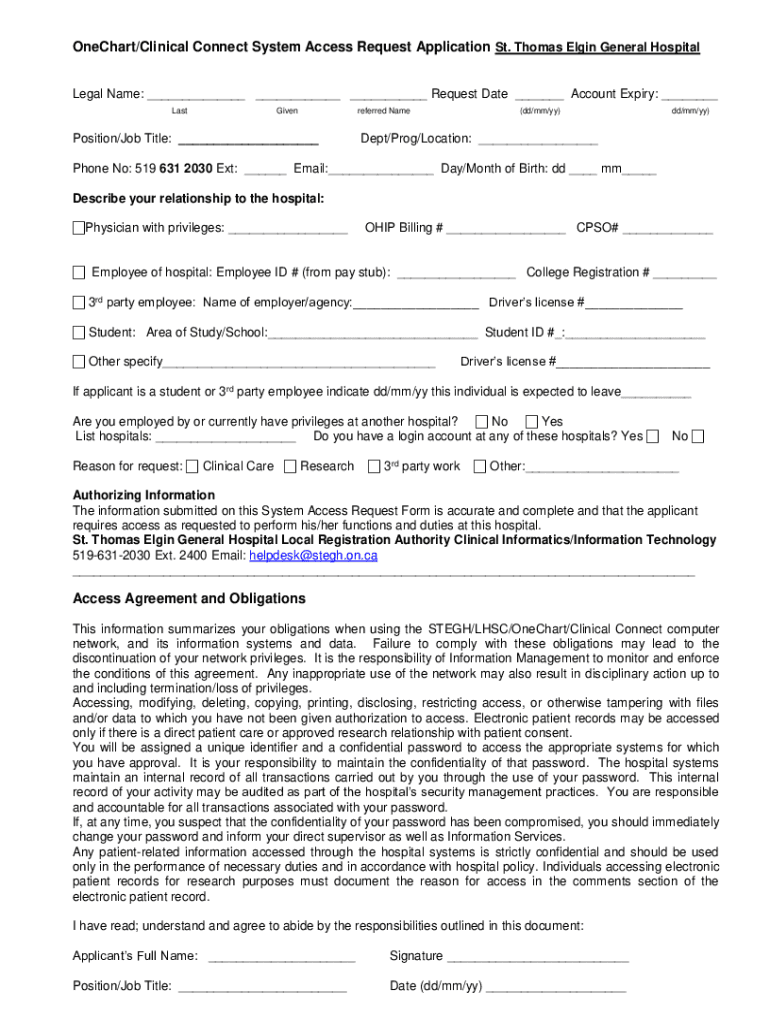 Chart/Clinical Connect System Access Request Application St. Thomas Elgin General Hospital Legal Name: ___ ___ ___ Request Date ___ Account Expiry: ___ LastGivenPosition/Job Title: ___referred Name(dd/mm/by)dd/mm/by)Dept/Pro/Location: