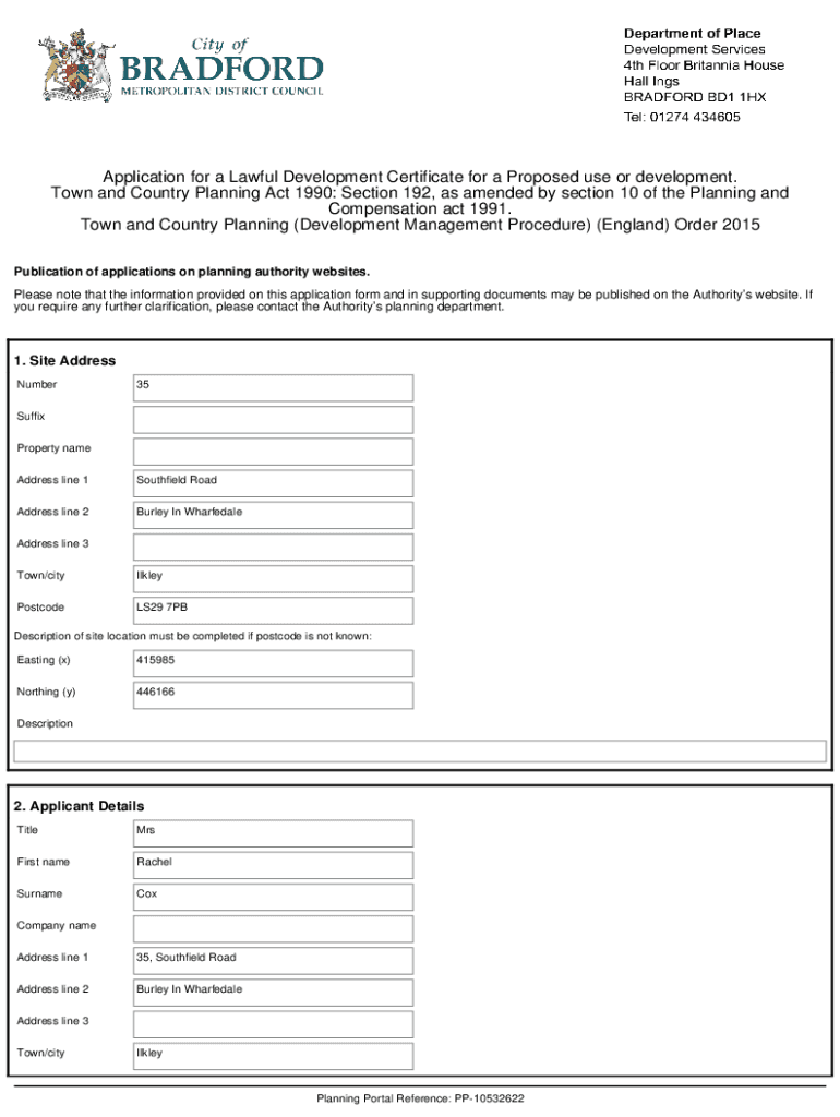 Application for a Lawful Development Certificate for a Proposed use or development. Town and Country Planning Act 1990: Section 192, as amended by section 10 of the Planning and Compensation act 1991.