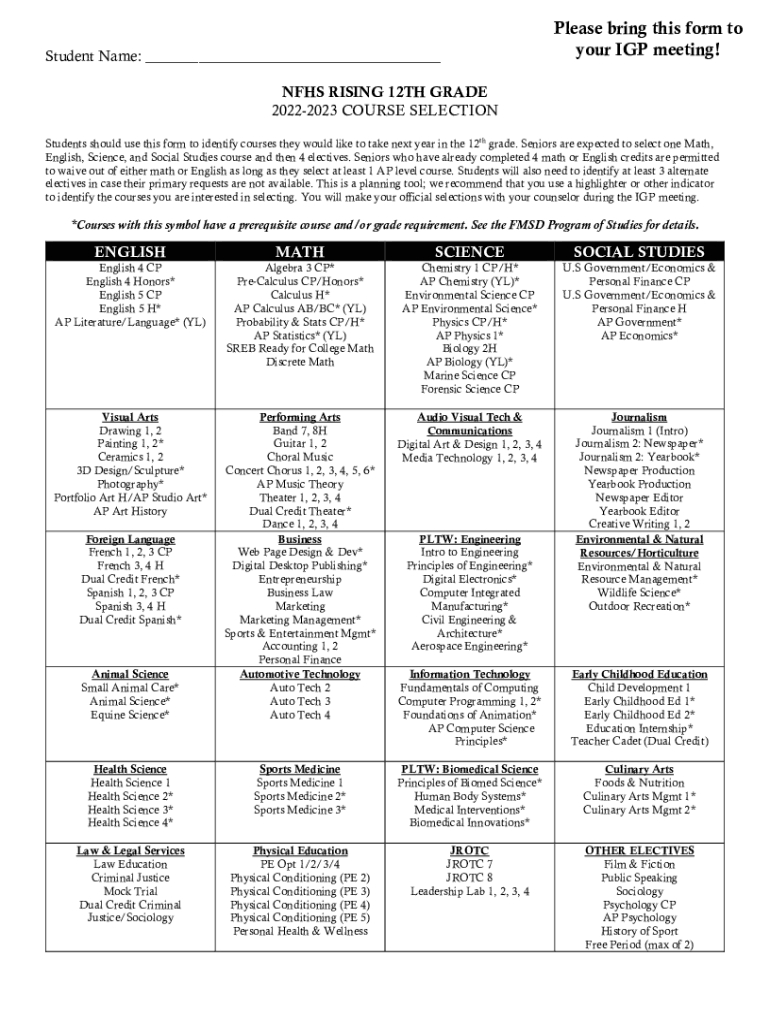 Student Name: ___Please bring this form to your IGP meeting!NFHS RISING 12TH GRADE 20222023 COURSE SELECTION Students should use this form to identify courses they would like to take next year in