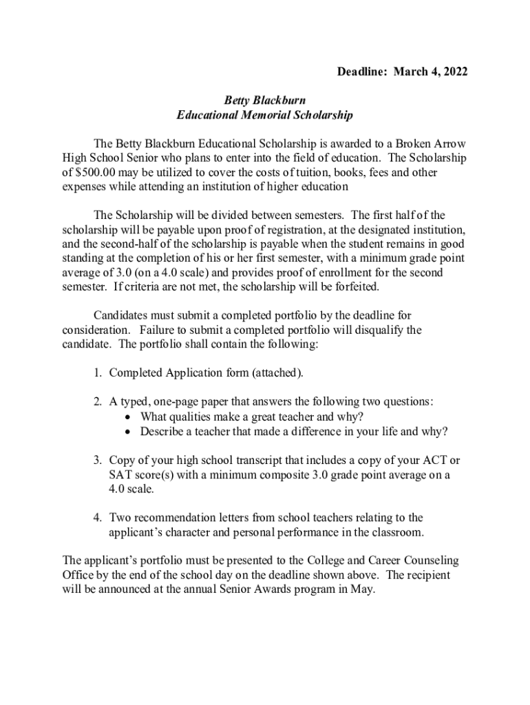 Deadline: March 4, 2022, Betty Blackburn Educational Memorial Scholarship The Betty Blackburn Educational Scholarship is awarded to a Broken Arrow High School Senior who plans to enter into the field