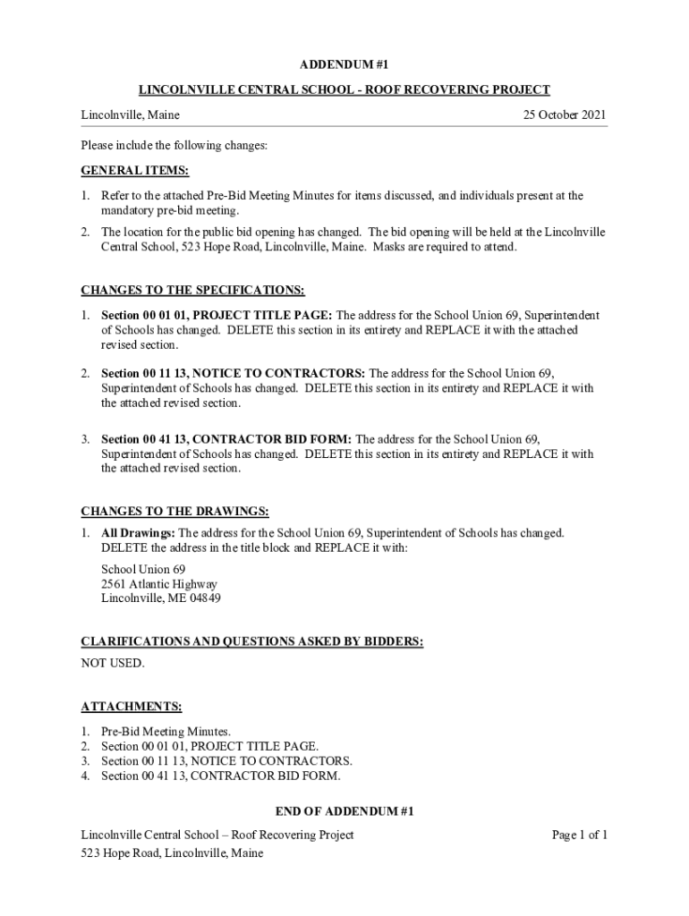 ADDENDUM #1 LINCOLNVILLE CENTRAL SCHOOL ROOF RECOVERING PROJECT Lincolnville, Maine25 October 2021Please include the following changes: GENERAL ITEMS: 1. Refer to the attached PreBid Meeting Minutes