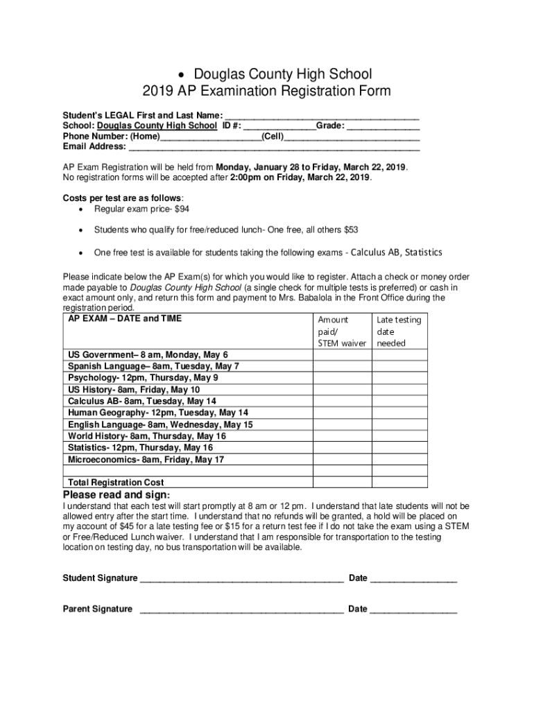 Douglas County High School 2019 AP Examination Registration Form Student\'s LEGAL First and Last Name: ___ School: Douglas County High School ID #: ___Grade: ___ Phone Number: (Home)___(Cell)___ Email