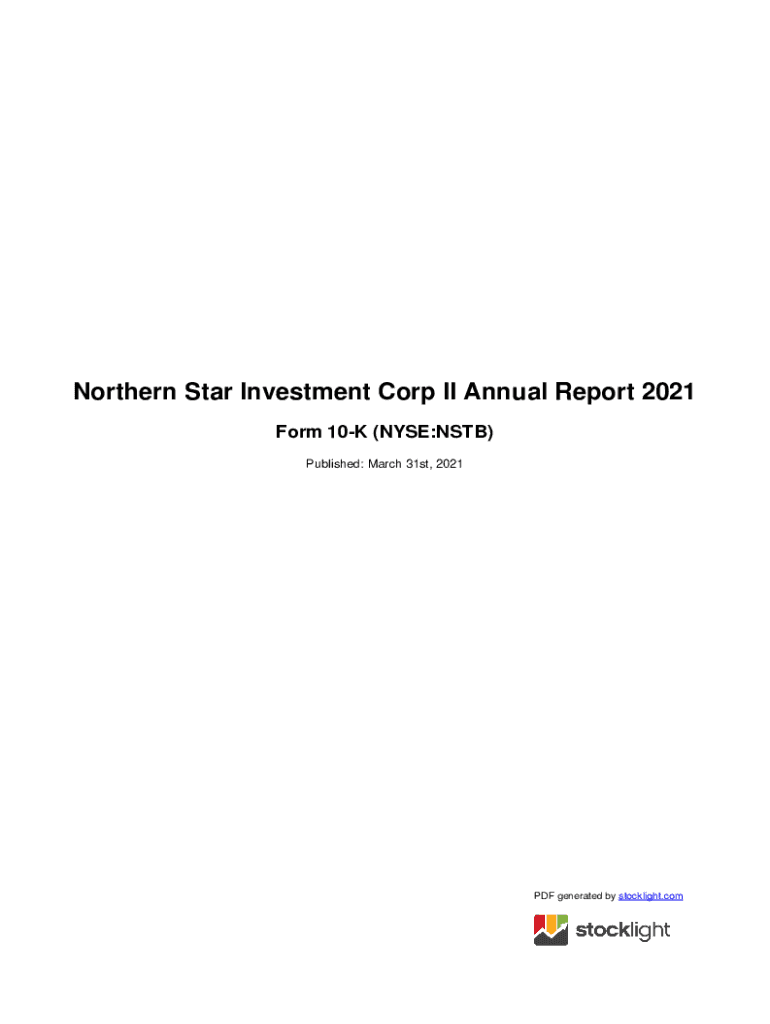 Northern Star Investment Corp II Annual Report 2021 Form 10K (NYSE:NTSB) Published: March 31st, 2021PDF generated by stock light. Counted STATES SECURITIES AND EXCHANGE COMMISSION Washington, D.C.