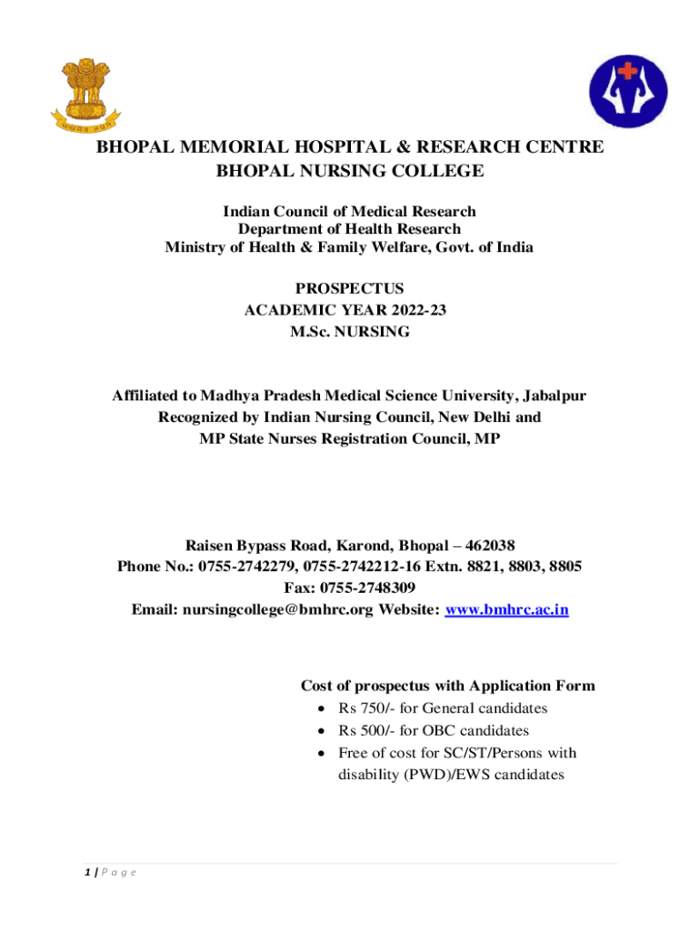 BHOPAL MEMORIAL HOSPITAL & RESEARCH Center BHOPAL NURSING COLLEGE Indian Council of Medical Research Department of Health Research Ministry of Health & Family Welfare, Govt. of India PROSPECTUS ACADEMIC
