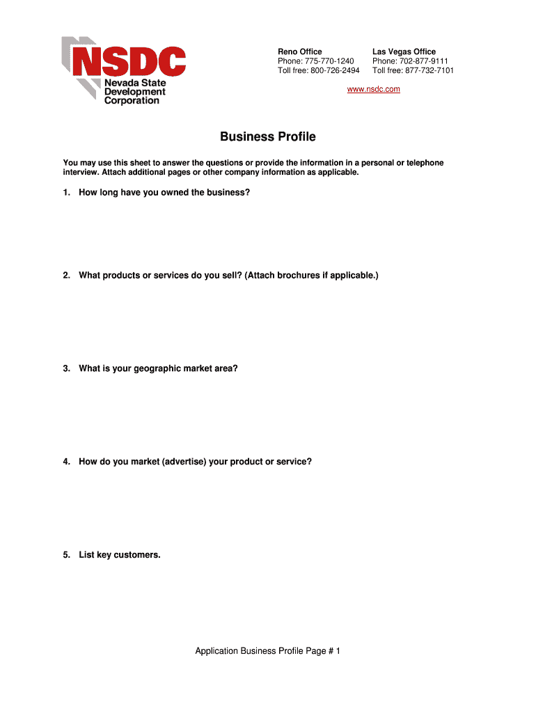 Reno Office Phone: 775-770-1240 Toll free: 800-726-2494 Las Vegas Office Phone: 702-877-9111 Toll free: 877-732-7101 www.nsdc.com Business Profile You may use this sheet to answer the questions or