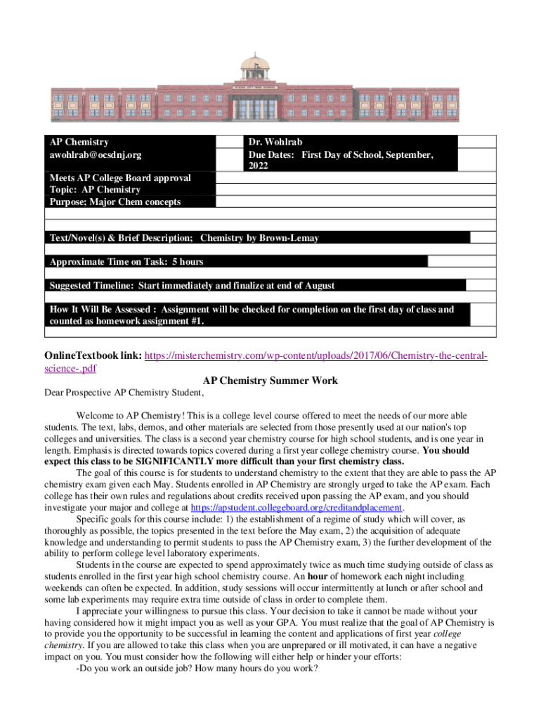 AP Chemistry awohlrab@ocsdnj.orgDr. Kohlrabi Due Dates: First Day of School, September, 2022Meets AP College Board approval Topic: AP Chemistry Purpose; Major Chem conceptsText/Novel(s) & Brief Description;