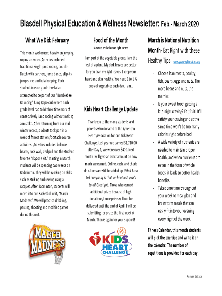 Blaisdell Physical Education & Wellness Newsletter: Feb. March 2020What We Did: FebruaryThis month we focused heavily on jumping roping activities. Activities included traditional single jump roping,
