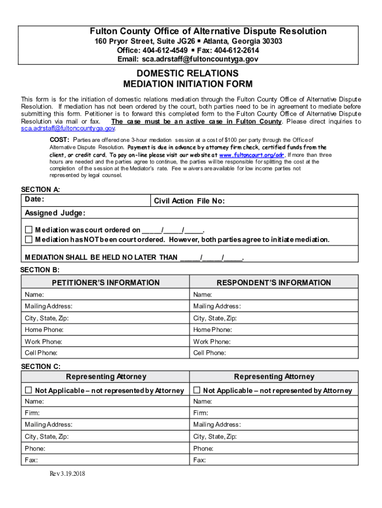Fulton County Office of Alternative Dispute Resolution 160 Pryor Street, Suite JG26 Atlanta, Georgia 30303 Office: 4046124549 Fax: 4046122614 Email: sca.adrstaff@fultoncountyga.govDOMESTIC RELATIONS
