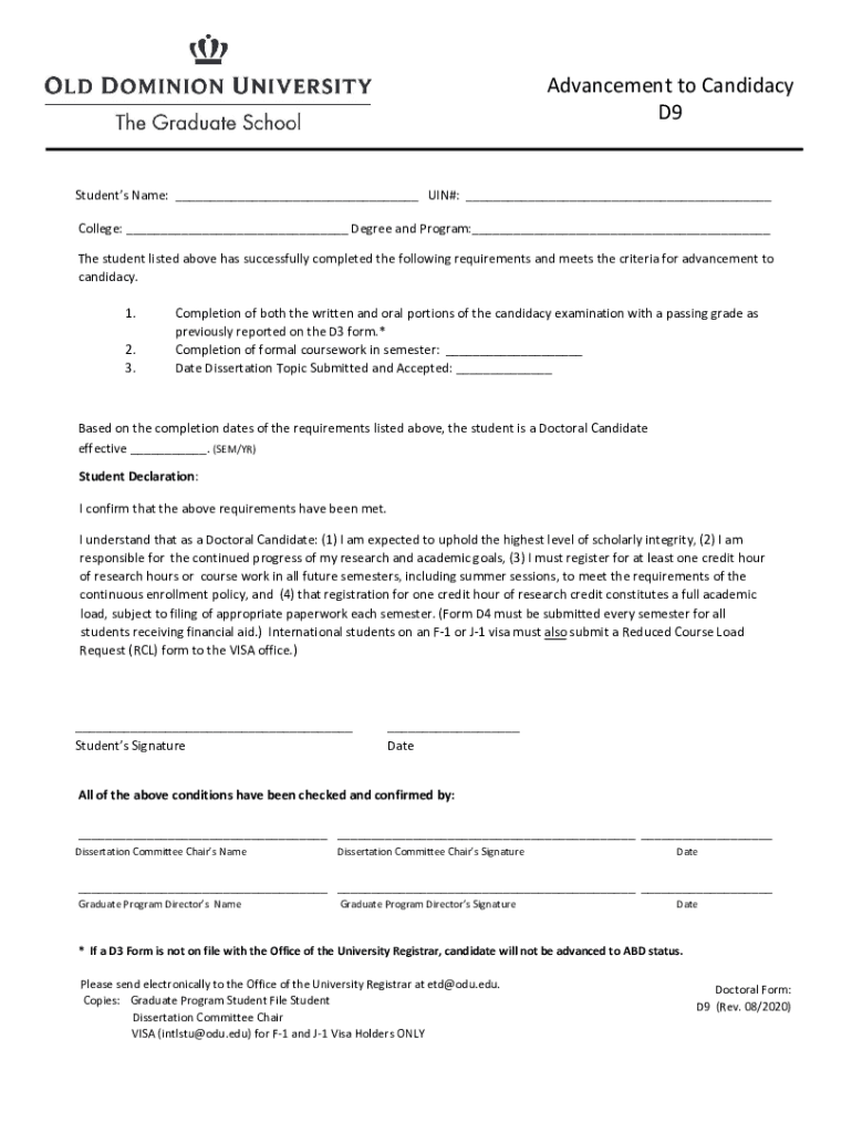 Advancement to Candidacy D9Students Name: ___ IN#: ___ College: ___ Degree and Program:___ The student listed above has successfully completed the following requirements and meets the criteria for