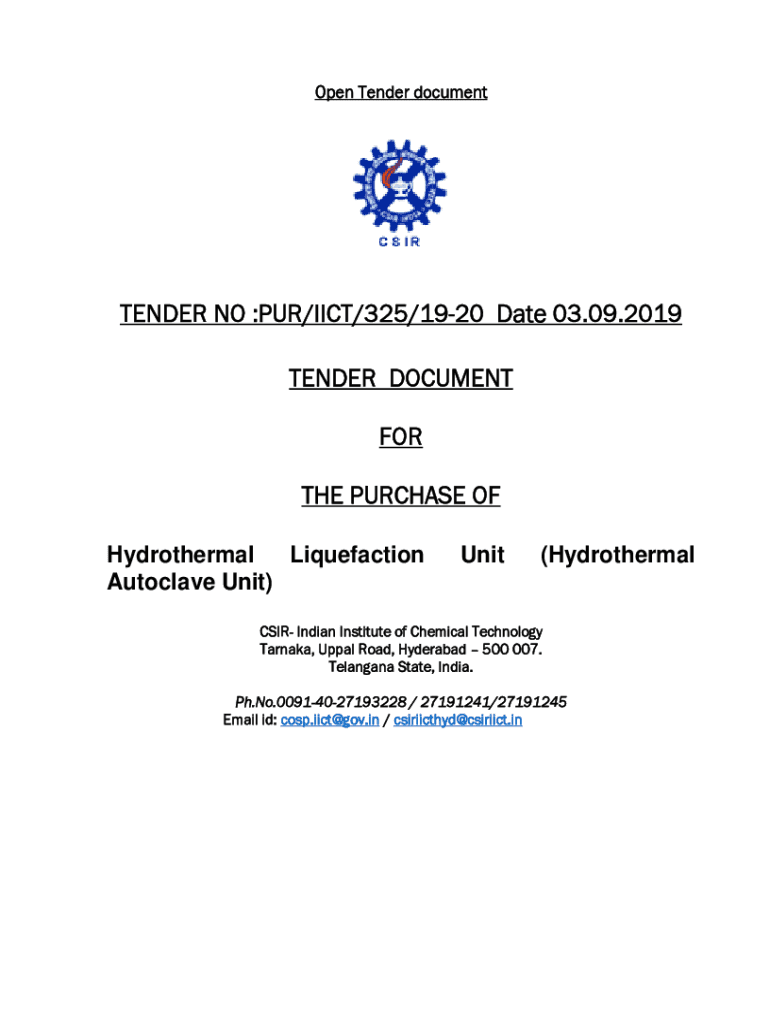 Open Tender documentTENDER NO :PUR/ICT/325/1920 Date 03.09.2019 TENDER DOCUMENT FOR THE PURCHASE OF Hydrothermal Liquefaction Autoclave Unit)Unit(HydrothermalCSIR Indian Institute of Chemical Technology
