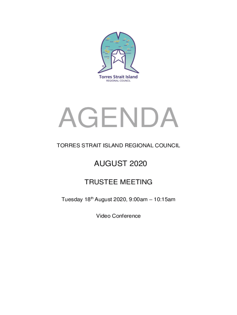 AGENDA TORRES STRAIT ISLAND REGIONAL COUNCILAUGUST 2020 TRUSTEE MEETING Tuesday 18th August 2020, 9:00am 10:15am Video Conference Tuesday 18th August 2020 Agenda Items 1.9:00am 9:03amOpening Prayer