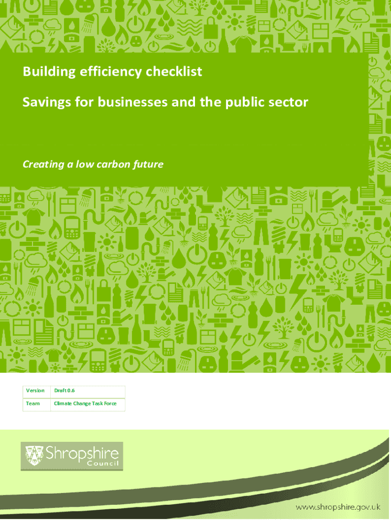 Building efficiency checklist Savings for businesses and the public sectorCreating a low carbon futureVersionDraft 0.6TeamClimate Change Task Force1Zero Carbon Shropshire 2030Contents 1Introduction3Savings