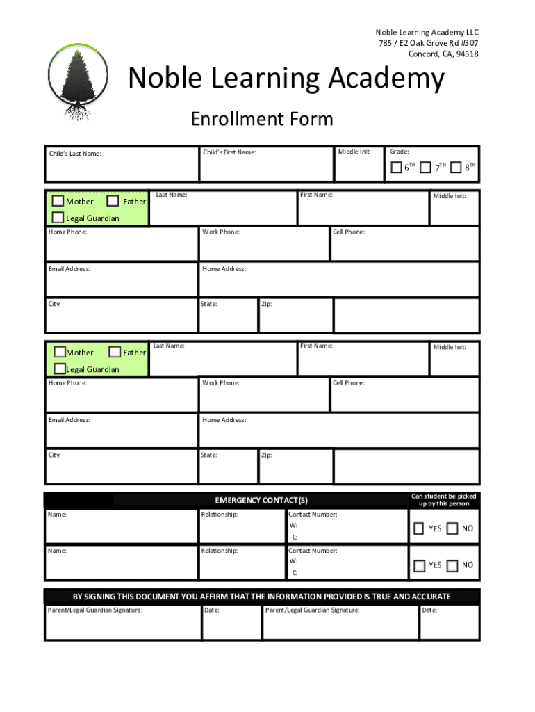 Noble Learning Academy LLC 785 / E2 Oak Grove Rd #307 Concord, CA, 94518Noble Learning Academy Enrollment Form Middle Unit:Child's First Name:Child's Last Name:Grade:6THMotherFatherLast Name:First