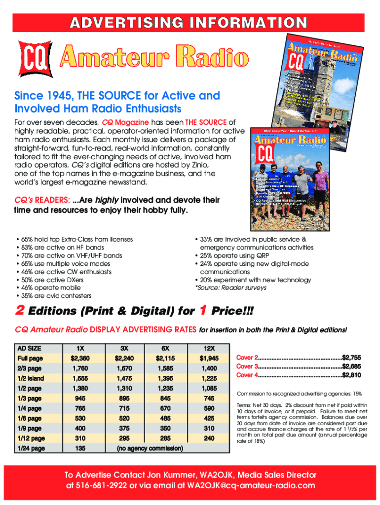 ADVERTISING INFORMATIONSince 1945, THE SOURCE for Active and Involved Ham Radio Enthusiasts For over seven decades, CD Magazine has been THE SOURCE of highly readable, practical, operator oriented