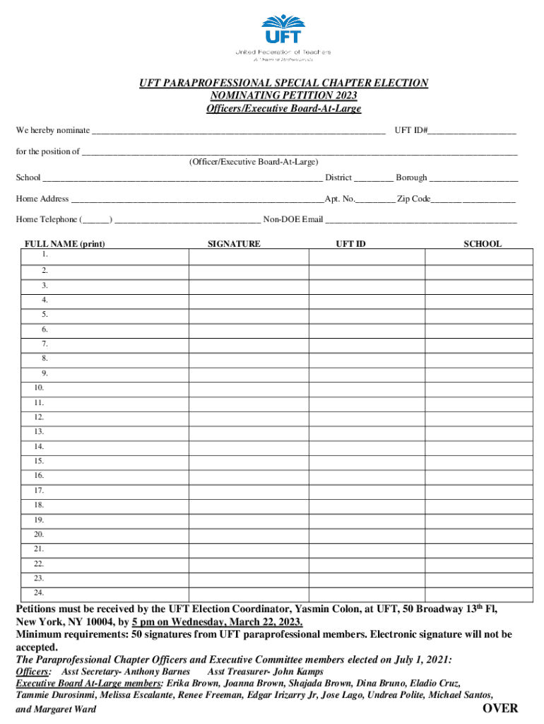 FT PARAPROFESSIONAL SPECIAL CHAPTER ELECTION NOMINATING PETITION 2023 Officers/Executive BoardAtLarge We hereby nominate ___FT ID#___for the position of ___ (Officer/Executive BoardAtLarge) School