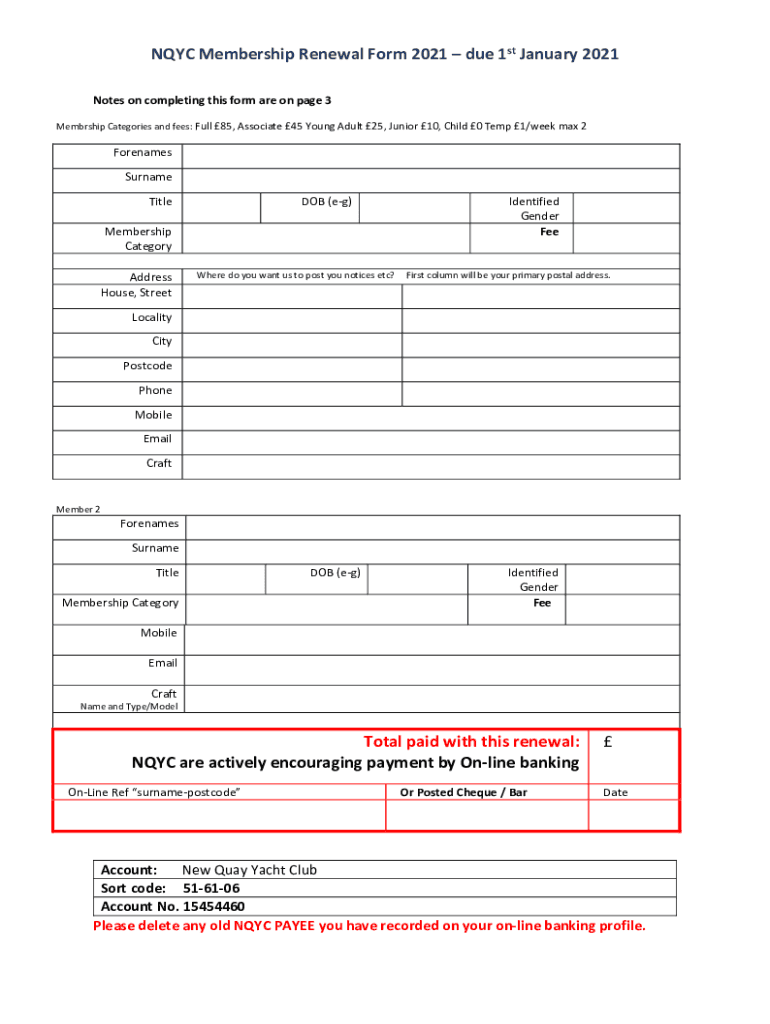 NYC Membership Renewal Form 2021 due 1st January 2021 Notes on completing this form are on page 3 Membership Categories and fees: Full 85, Associate 45 Young Adult 25, Junior 10, Child 0 Temp 1/week