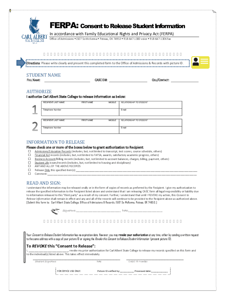 FER PA: Consent to Release Student Information In accordance with Family Educational Rights and Privacy Act (FER PA) Office of Admissions 1507 So McKenna Plateau, OK 74953 9186471300 voice 9186471306
