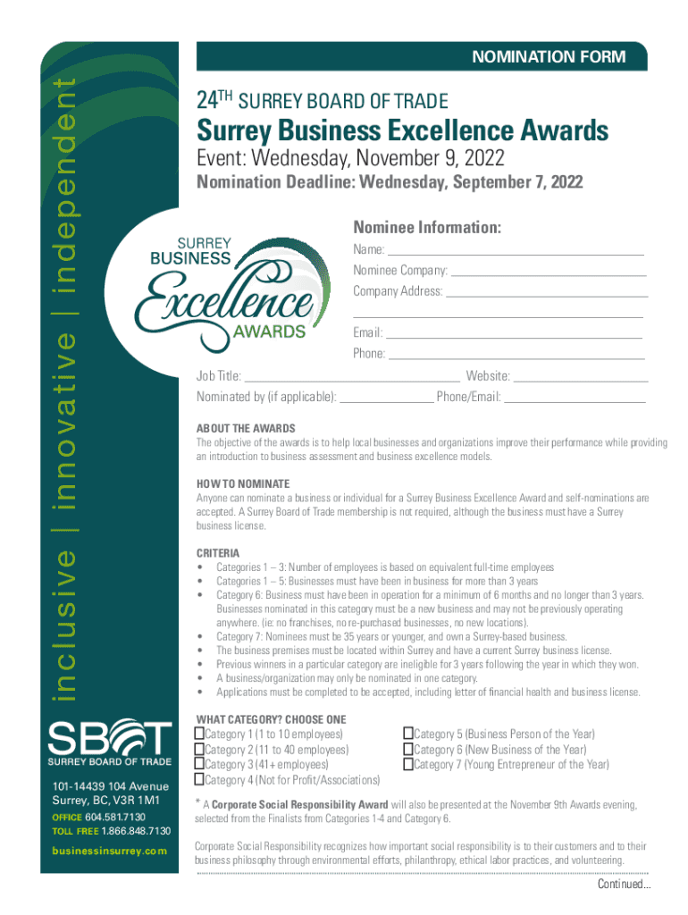 Inclusive | innovative | independentNOMINATION FORM24TH SURREY BOARD OF TRADESurrey Business Excellence Awards Event: Wednesday, November 9, 2022Nomination Deadline: Wednesday, September 7, 2022,