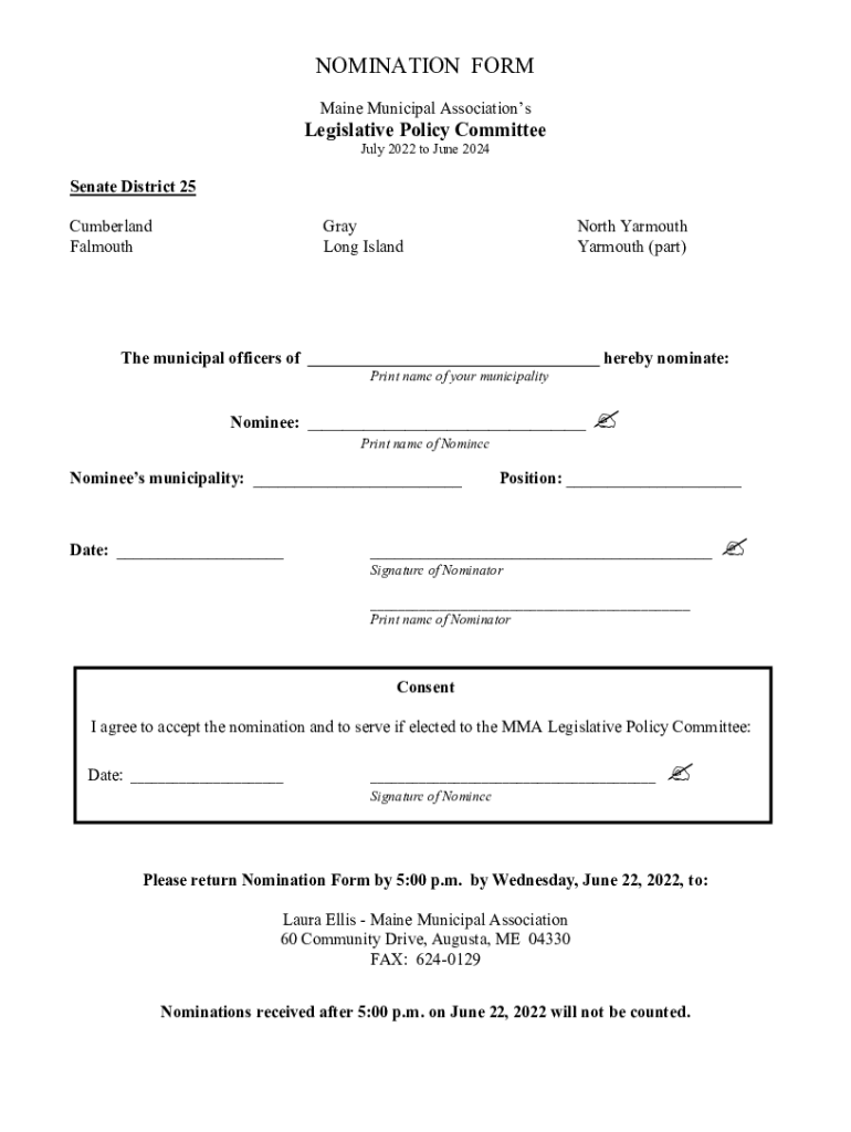 NOMINATION FORM Maine Municipal AssociationsLegislative Policy Committee July 2022 to June 2024Senate District 25 Cumberland FalmouthGray Long Island North Yarmouth (part)The municipal officers of