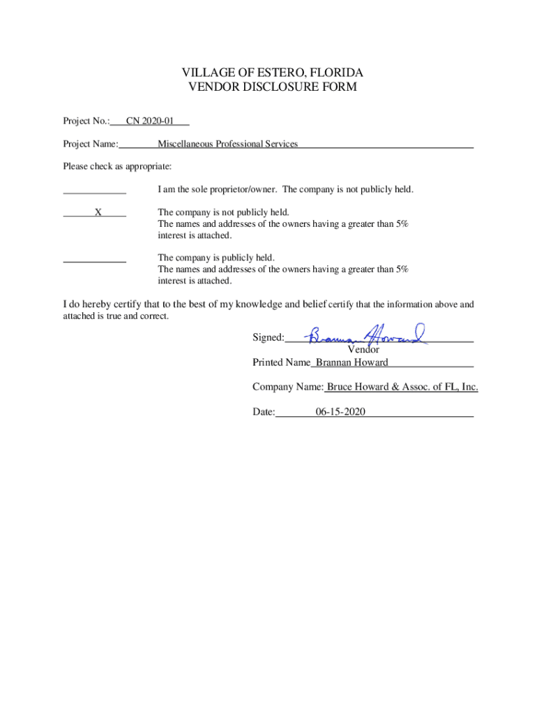 VILLAGE OF ESTER, FLORIDA VENDOR DISCLOSURE FORM Project No.: Project Name:CN 202001 Miscellaneous Professional ServicesPlease check as appropriate: I am the sole proprietor/owner. The company is
