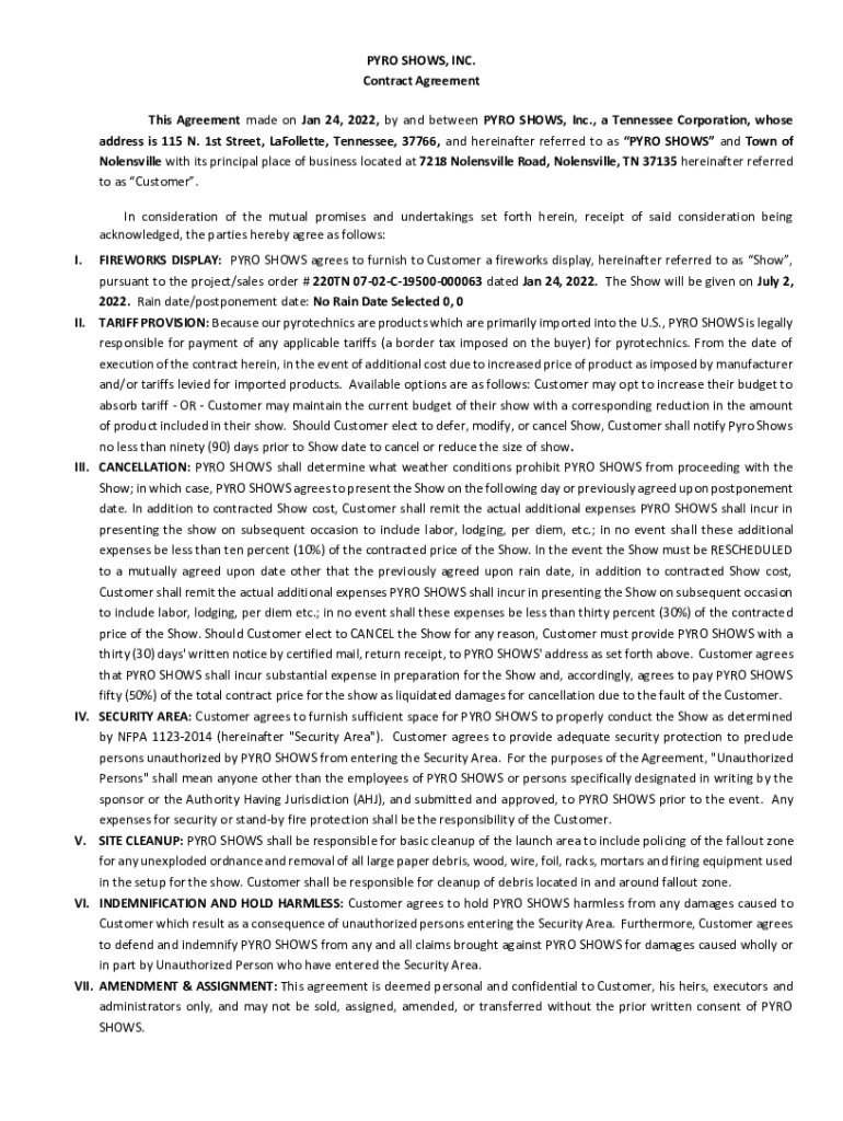 PRO SHOWS, INC. Contract Agreement This Agreement made on Jan 24, 2022, by and between PRO SHOWS, Inc., a Tennessee Corporation, whose address is 115 N. 1st Street, LaFollette, Tennessee, 37766, and