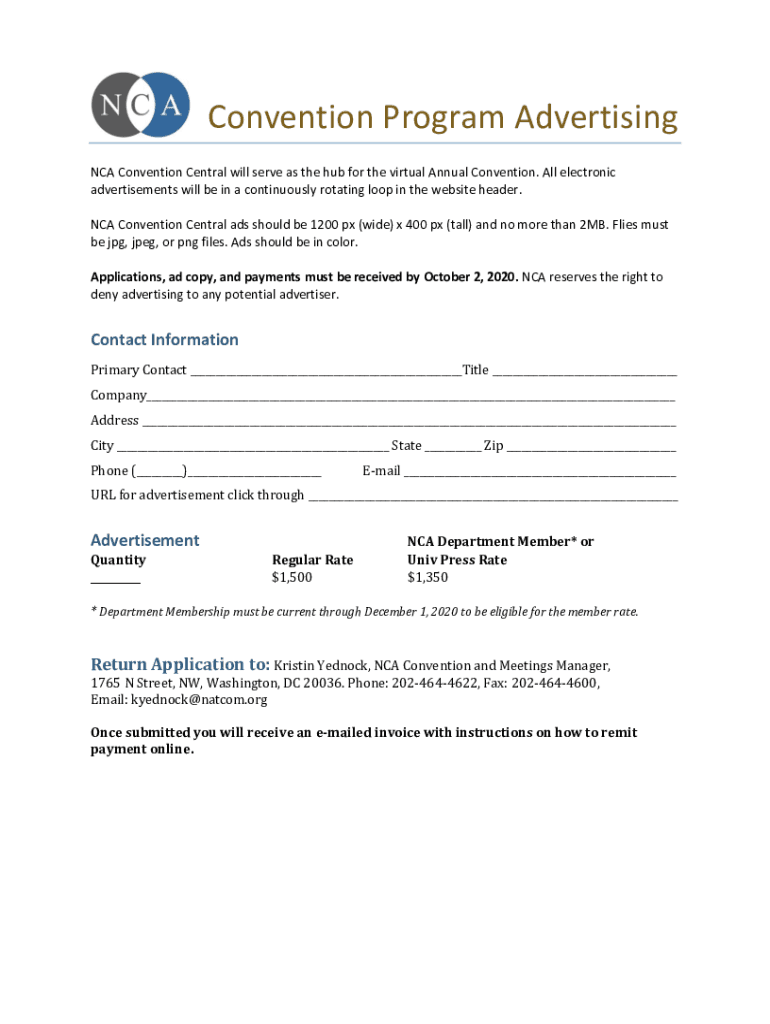 Convention Program Advertising NCA Convention Central will serve as the hub for the virtual Annual Convention. All electronic advertisements will be in a continuously rotating loop in the website