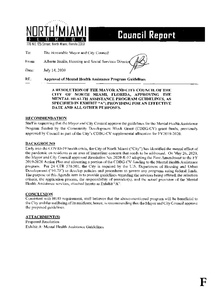 778 N.E.l25 Street, North Miami, Frida 33lElTo:The Honorable Mayor and City Councilor:Albert Battle, Housing and Social ServicesDate:July 14,2020RE:Approval of Mental Health Assistance