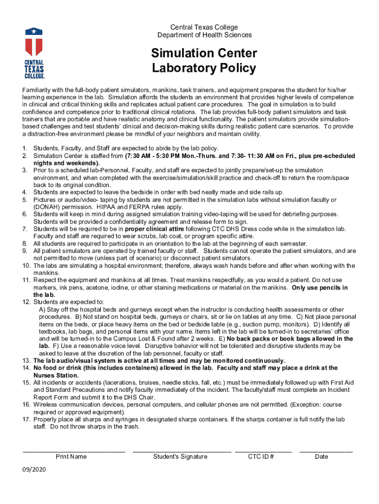 Central Texas College Department of Health SciencesSimulation Center Laboratory Policy Familiarity with the full body patient simulators, manikins, task trainers, and equipment prepares the student