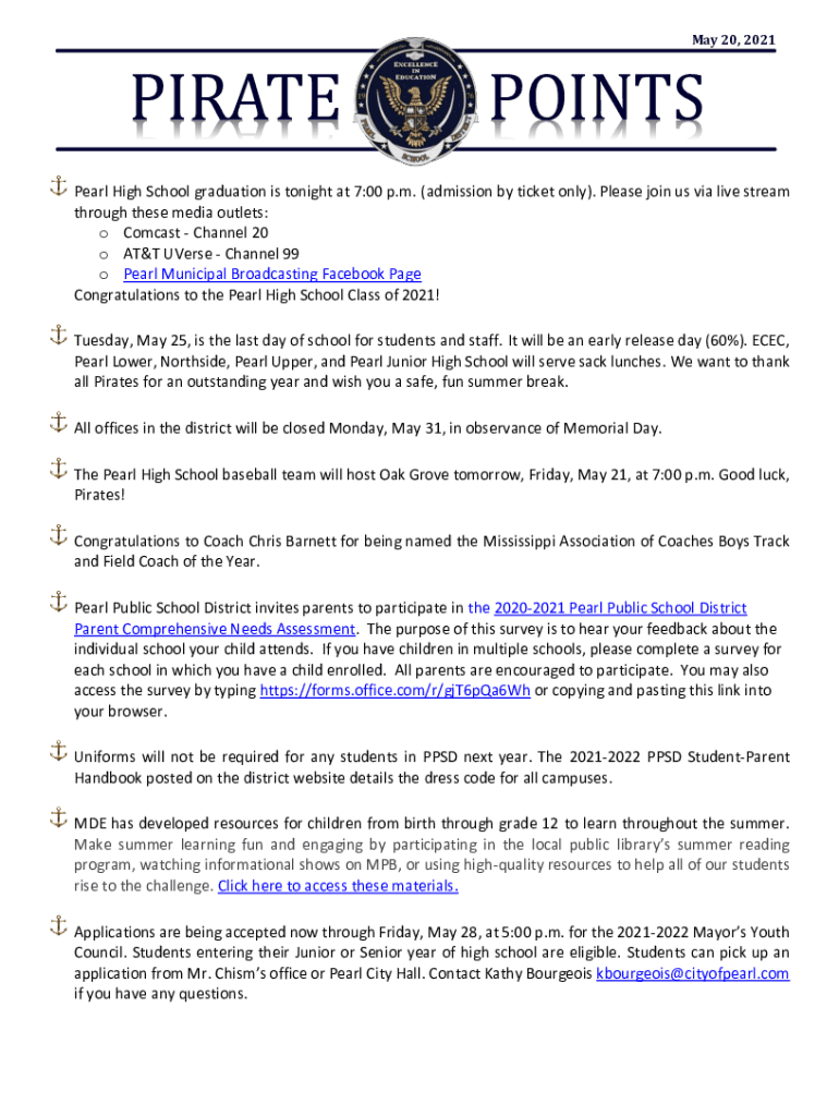 May 20, 2021PIRATEPOINTSPearl High School graduation is tonight at 7:00 p.m. (admission by ticket only). Please join us via live stream through these media outlets: o Comcast Channel 20 o AT&T Verse
