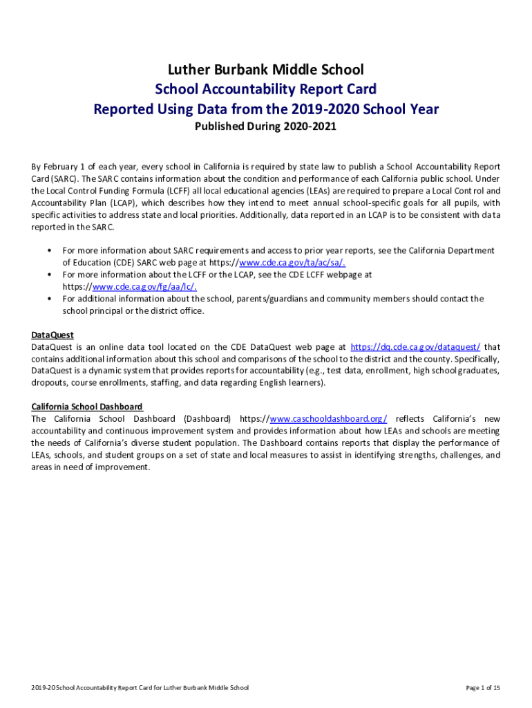 Luther Burbank Middle School Accountability Report Card Reported Using Data from the 20192020 School Year Published During 20202021 By February 1 of each year, every school in California is required