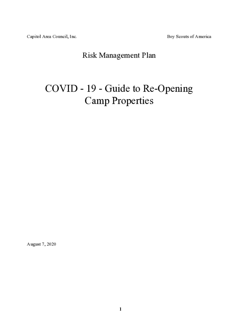 Capitol Area Council, Inc. Boy Scouts of Americanism Management Plan COVID-19 Guide to Reopening Camp Properties August 7, 20201Capitol Area Council Risk Management Plan 2020 Fall / Winter CampingIntroduction