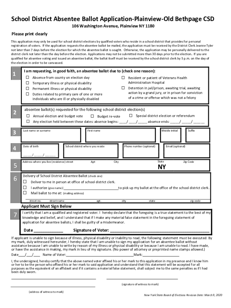 School District Absentee Ballot ApplicationPlainviewOld Beth page CSD 106 Washington Avenue, Plain view NY 1180Please print clearly This application may only be used for school district elections