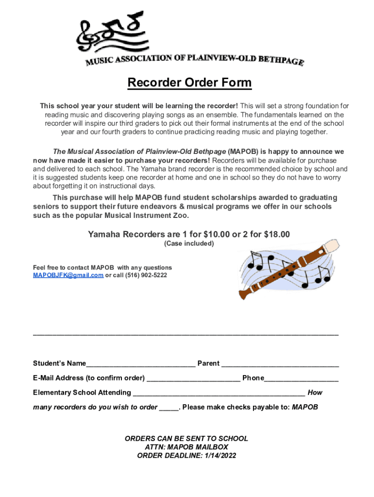 Recorder Order Form This school year your student will be learning the recorder! This will set a strong foundation for reading music and discovering playing songs as an ensemble. The fundamentals