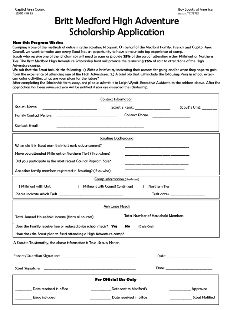 Capitol Area Councilor Scouts of America12500 N IH 35Austin, TX 78753Britt Medford High Adventure Scholarship Application this Program Works:Camping is one of the methods of delivering the Scouting