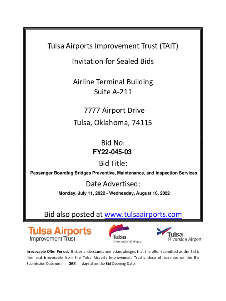 Tulsa Airports Improvement Trust (WAIT) Invitation for Sealed Bids Airline Terminal Building Suite A211 7777 Airport Drive Tulsa, Oklahoma, 74115 Bid No: FY2204503Bid Title: Passenger Boarding Bridges