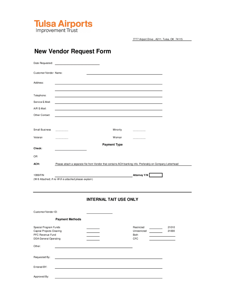 7777 Airport Drive, A211, Tulsa, OK 74115New Vendor Request Form Date Requested:Customer/Vendor Name:Address:Telephone: Service Email: A/RE Mail: Other Contact:Small Business___Minority___Veteran___Woman___Payment