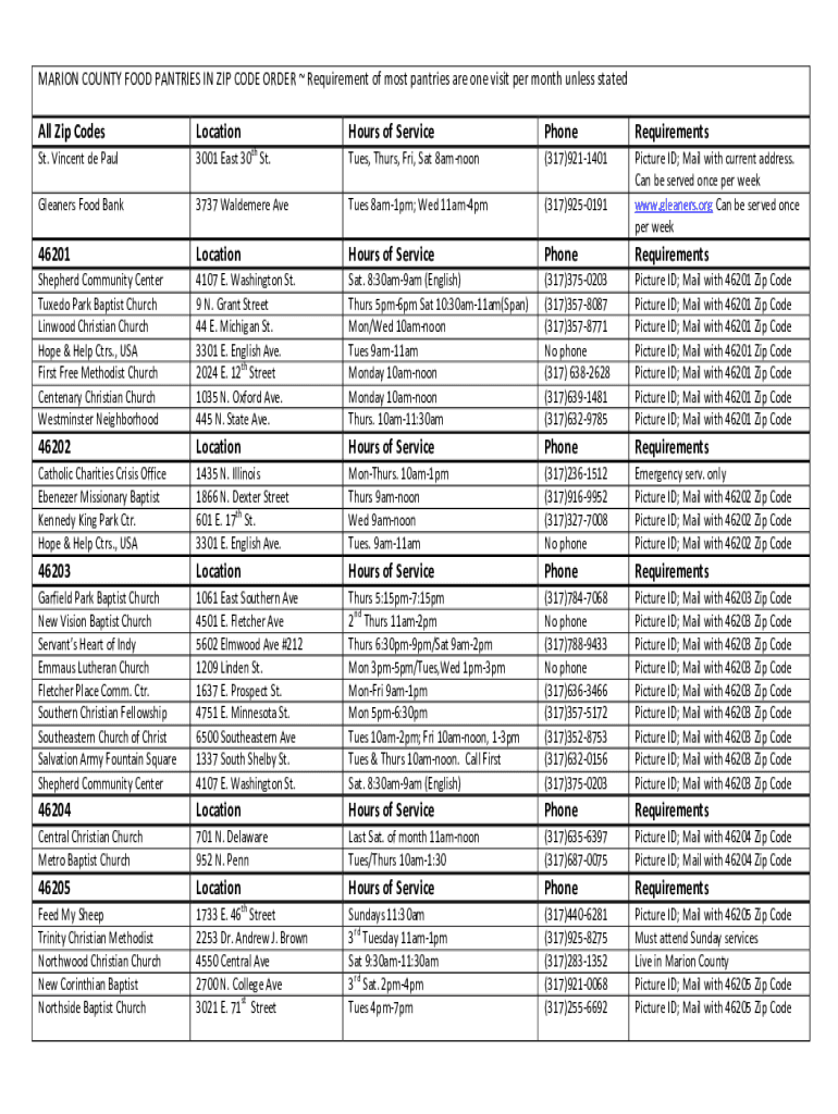 MARION COUNTY FOOD PANTRIES IN ZIP CODE ORDER Requirement of most pantries are one visit per month unless stated Zip Dislocation