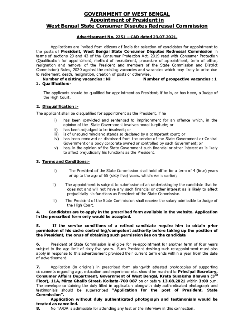 GOVERNMENT OF WEST BENGAL Appointment of President in West Bengal State Consumer Disputes Reparation Commission Advertisement No. 2251 CAD dated 23.07.2021. Applications are invited from citizens